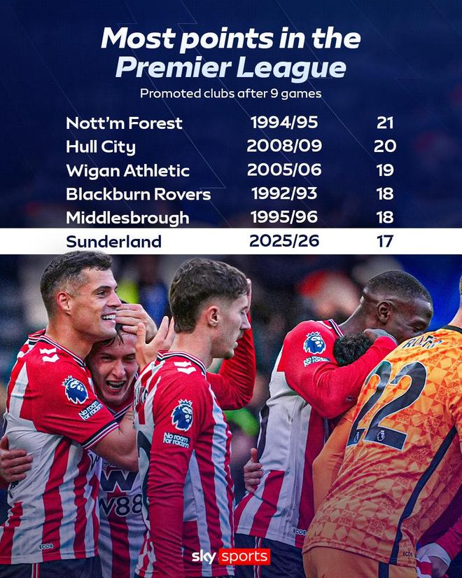 赛后来自天空体育的统计指出,桑德兰本赛季英超前9轮拿到了17分,这样的成绩能够排在英超历史升班马联赛同期的第6位,仅次于1994-95赛季的诺丁汉森林(9轮21分)、2008-09赛季的赫尔城(9轮20分)、2005-06赛季的维冈竞技(9轮19分)、1992-93赛季的布莱克本流浪者(9轮18分)以及1995-96赛季的米德尔斯堡(9轮18分)。